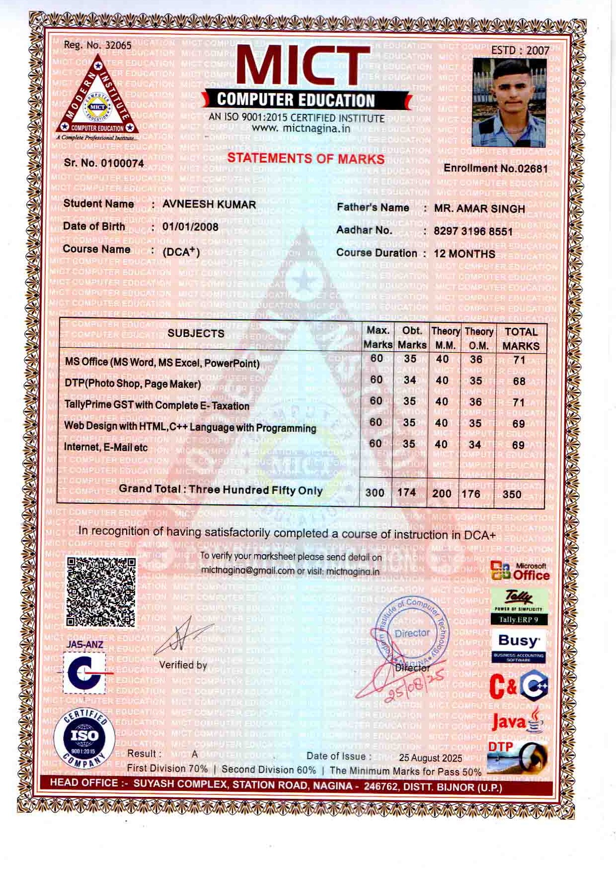 | 3 | AVNEESH KUMAR | MR. AMAR SINGH | 02681 | DCA+ | Diploma | Regular | Click Here to Verification |