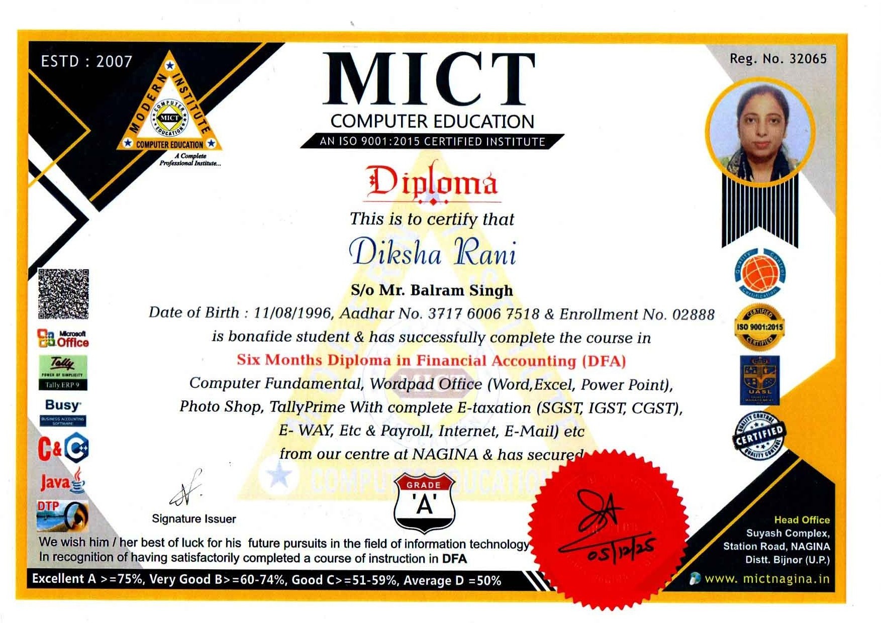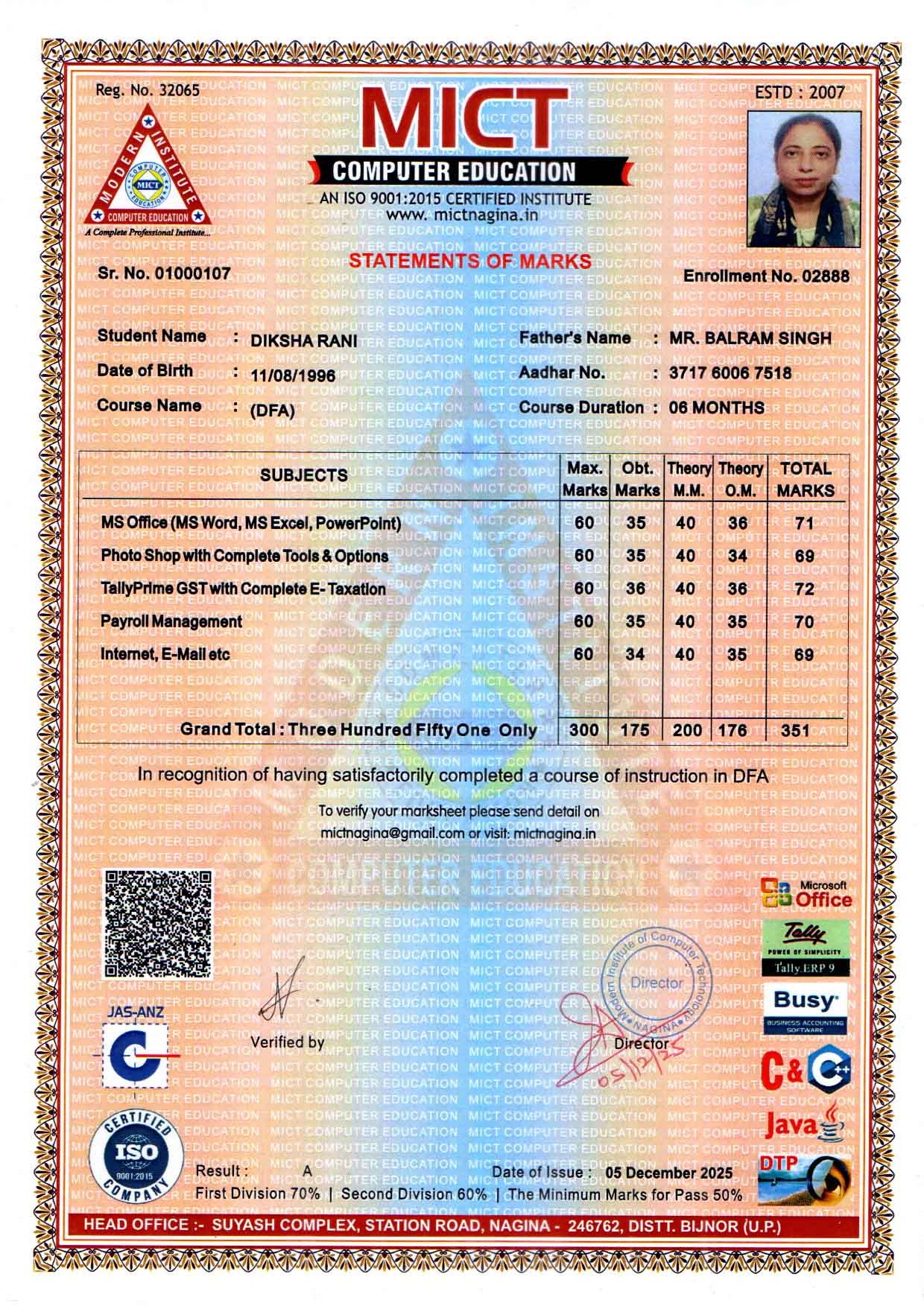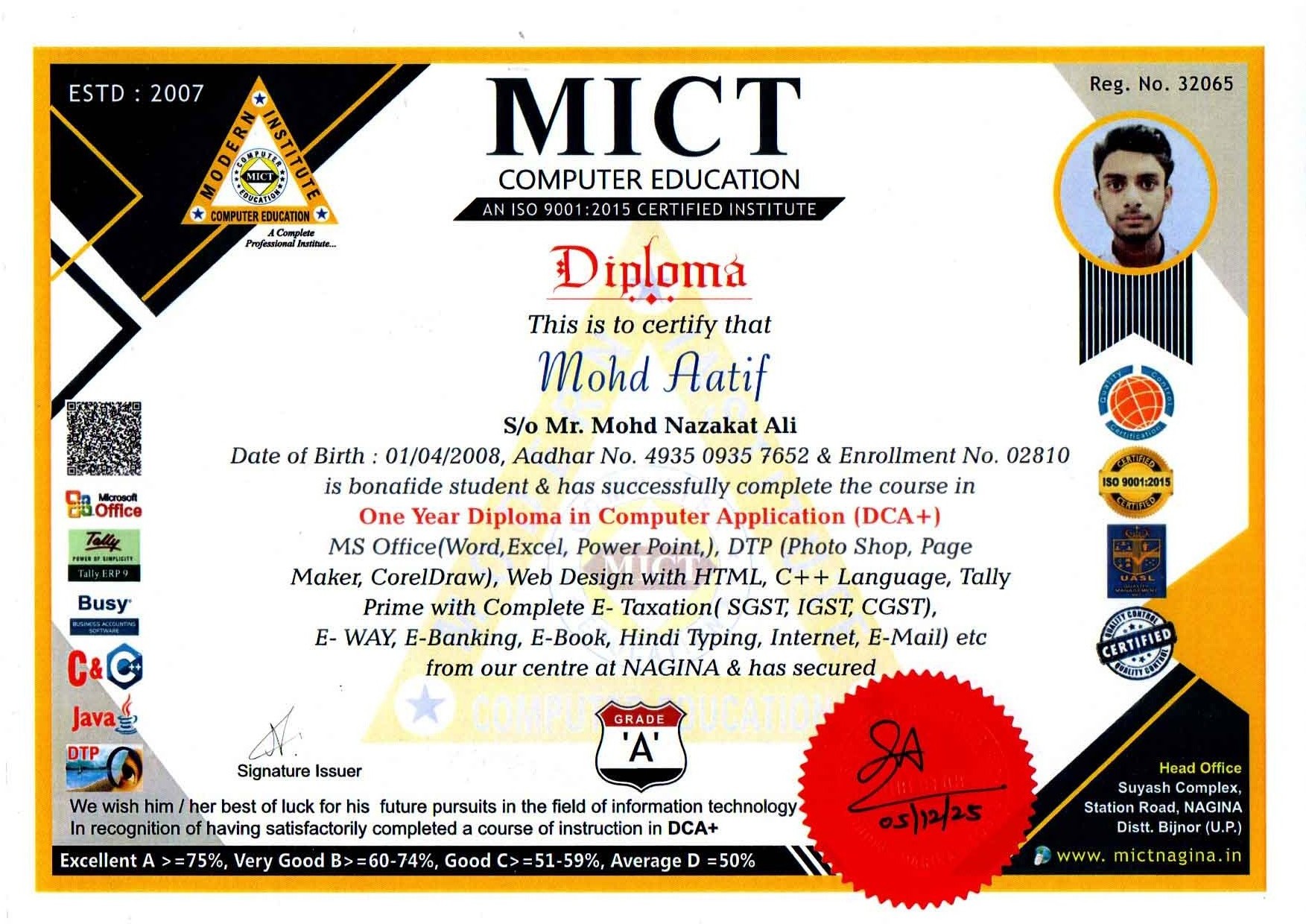 | 5 | MOHD AATIF | MR. MOHD NAZAKAT ALI | 02810 | DCA+ | Diploma | Regular | Click Here to Verification | ||