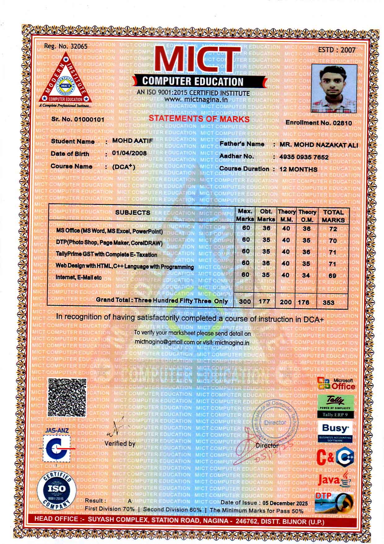 | 6 | MOHD AATIF | MR. MOHD NAZAKAT ALI | 02810 | DCA+ | Marksheet | Regular | Click Here to Verification | ||