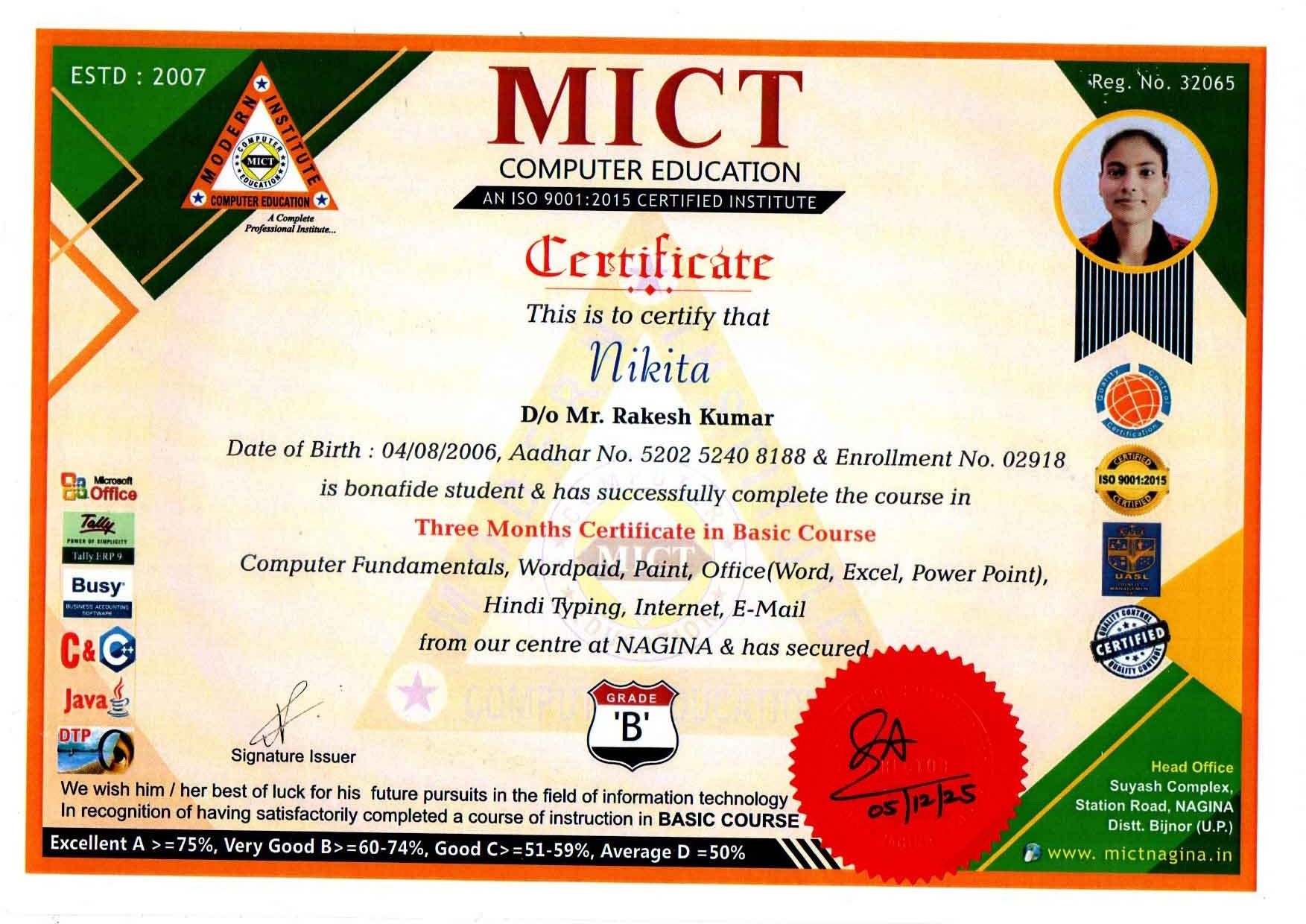 | 20 | NIKITA | MR. RAKESH KUMAR | 02918 | BASIC | CERTIFICATE | Regular | Click Here to Verification | ||