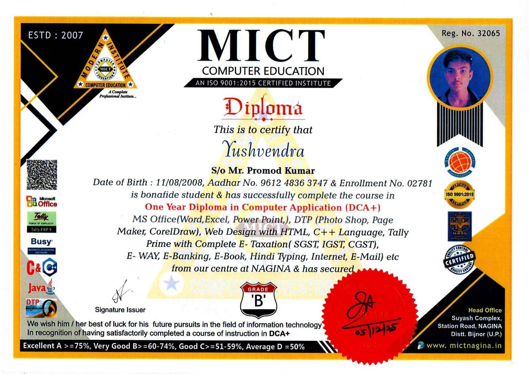 | 9 | YUSHVENDRA | MR. PARMOD KUMAR | 02781 | DCA+ | Diploma | Regular | Click Here to Verification | ||