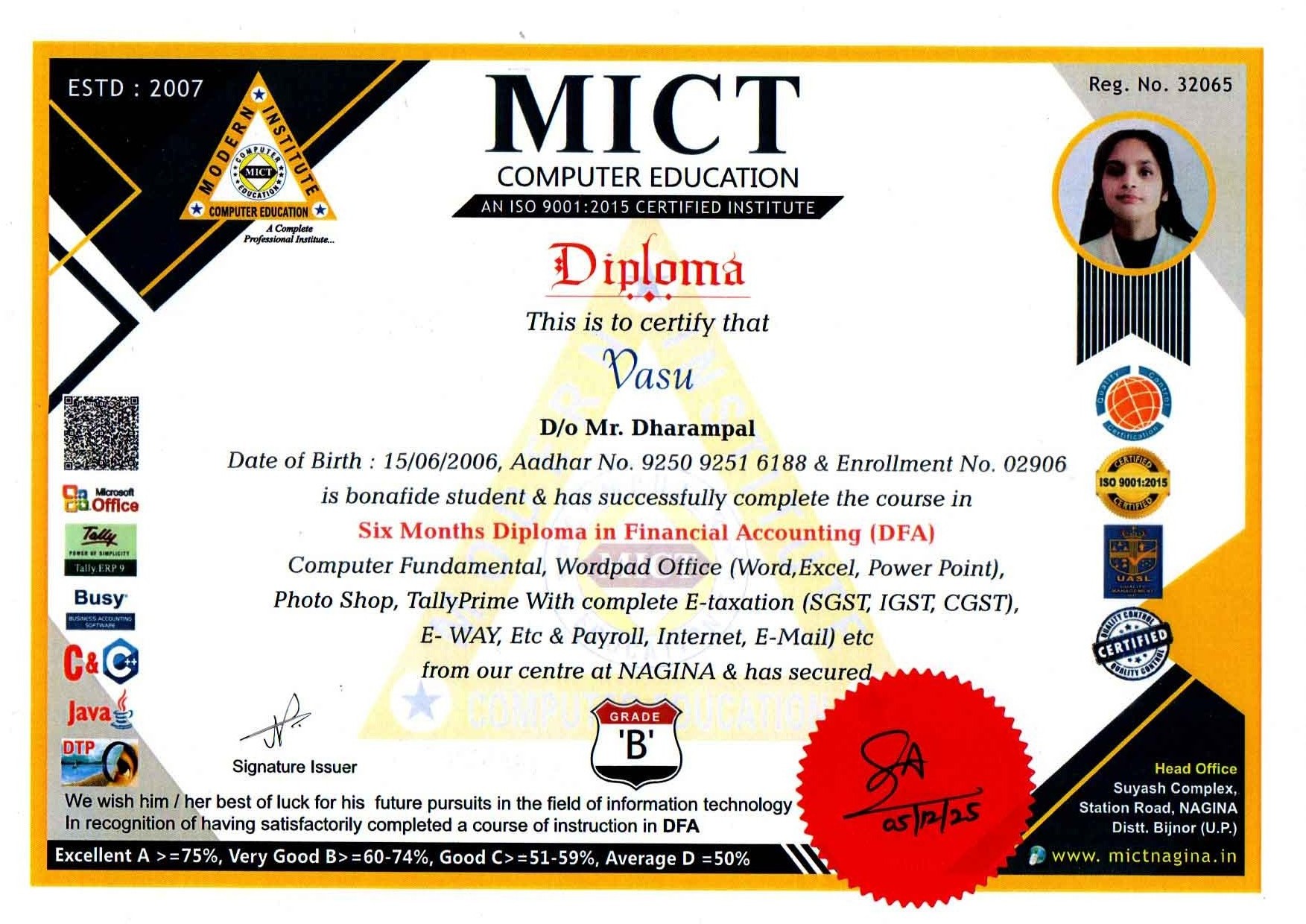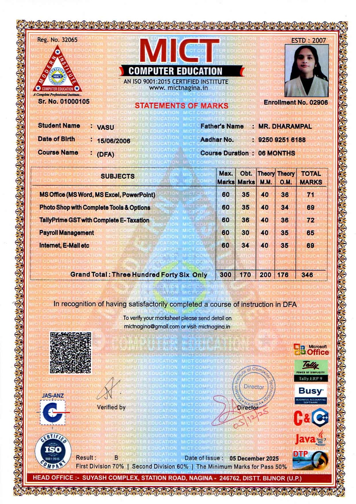 | 2 | VASU | MR. DHARAMPAL | 02906 | DFA | Marksheet | Regular | Click Here to Verification | ||
