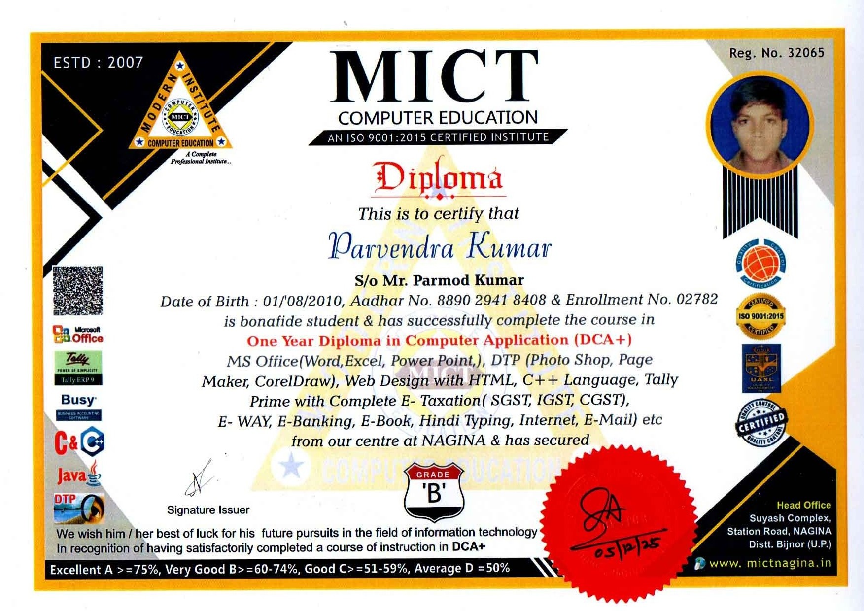 | 7 | PARVENDRA KUMAR | MR. PARMOD KUMAR | 02782 | DCA+ | Diploma | Regular | Click Here to Verification | ||