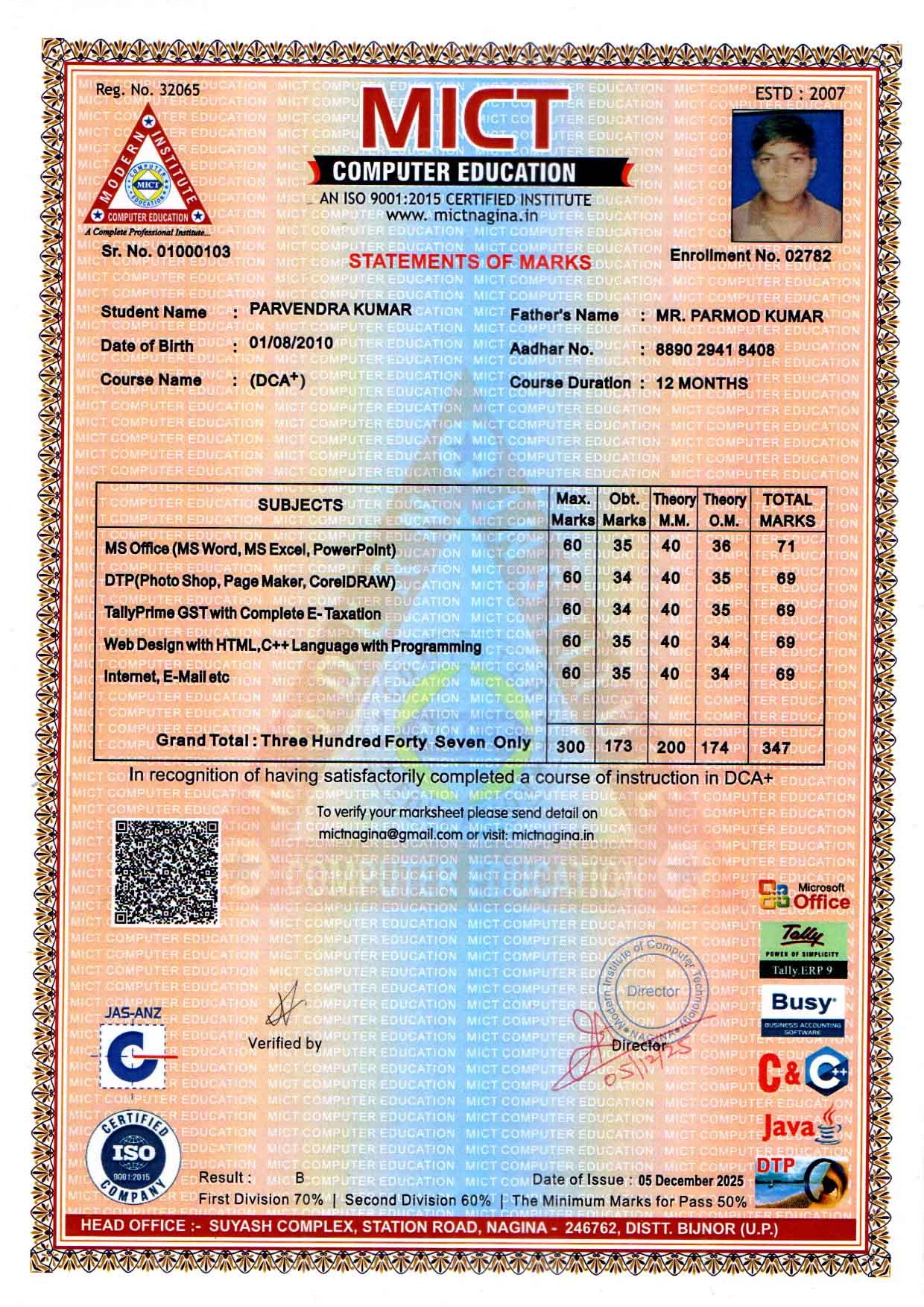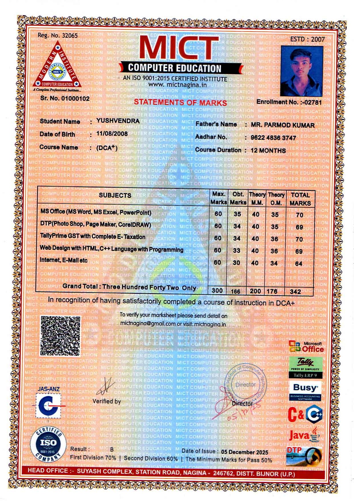 | 10 | YUSHVENDRA | MR. PARMOD KUMAR | 02781 | DCA+ | Marksheet | Regular | Click Here to Verification | ||